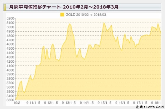 近年の金相場は、2003年に年間平均価格が1,400円/gであったのに対し、10年後の2013年4月には5,800円と約3.5倍以上にまで膨れ上がり、2018年現在は2013年頃に比べると金価格は一旦落ち着いていますが、引き続き高水準をキープしています。